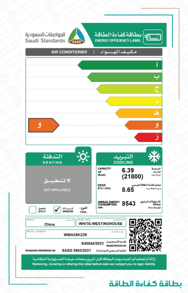 مستوى كفاءة الطاقة: و (SEER: 8.65)